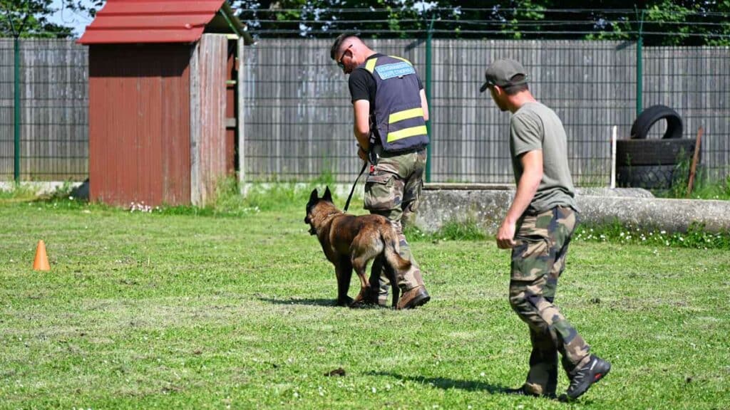 Direction l’un des complexes d’entrainement du CNICG. Ce matin, chacun leur tour, Boss, Chicane, Urus, Vegas, Hooper et Huska vont s’exercer à la recherche de matières. Et notamment de produits stupéfiants. Âgé de 16 mois, c’est Boss qui ouvre le bal. Il est encore un peu tôt pour le faire travailler avec de vraies matières stupéfiantes. Aujourd’hui, son objectif sera de retrouver des jouets. « Tout le travail du chien repose sur le jeu », explique l’adjudant Cédric. L’exercice consiste ici à travailler sur des « cônes d’odeur ». « On essaye d’apprendre au chien à se servir de son nez en fermant la gueule, de manière à ce que davantage d’odeurs passent à travers les capteurs de son museau. » Exercice concluant pour Boss. À peine guidé par son dresseur, il parvient sans grande difficultés à trouver les balles vertes, dissimulées dans la maison qui reconstitue les pièces d’un appartement.
