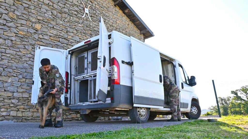 Dans son véhicule spécialement équipé, le dresseur-instructeur peut embarquer jusqu’à huit chiens. (Photo: L.Picard / L’Essor)
